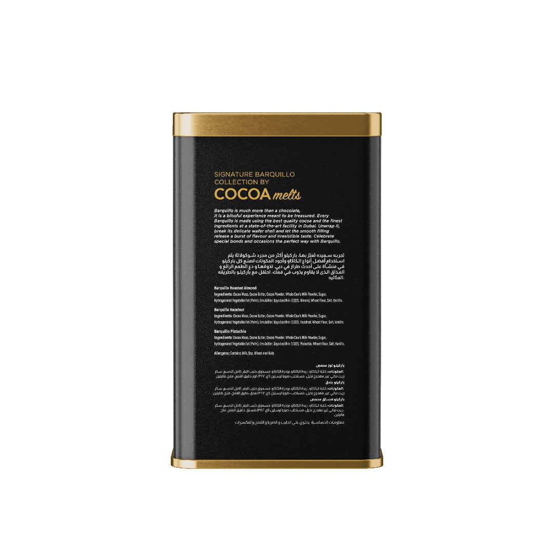 Revel in a tantalising symphony of flavours with Cocoa Melts' scrumptious Assorted Barquillo. Each premium chocolate pack is lovingly filled with a medley of rich and velvety Hazelnut, Roasted Almond, and Pistachio. Satisfy your cravings and let your taste buds relish its pure bliss!
