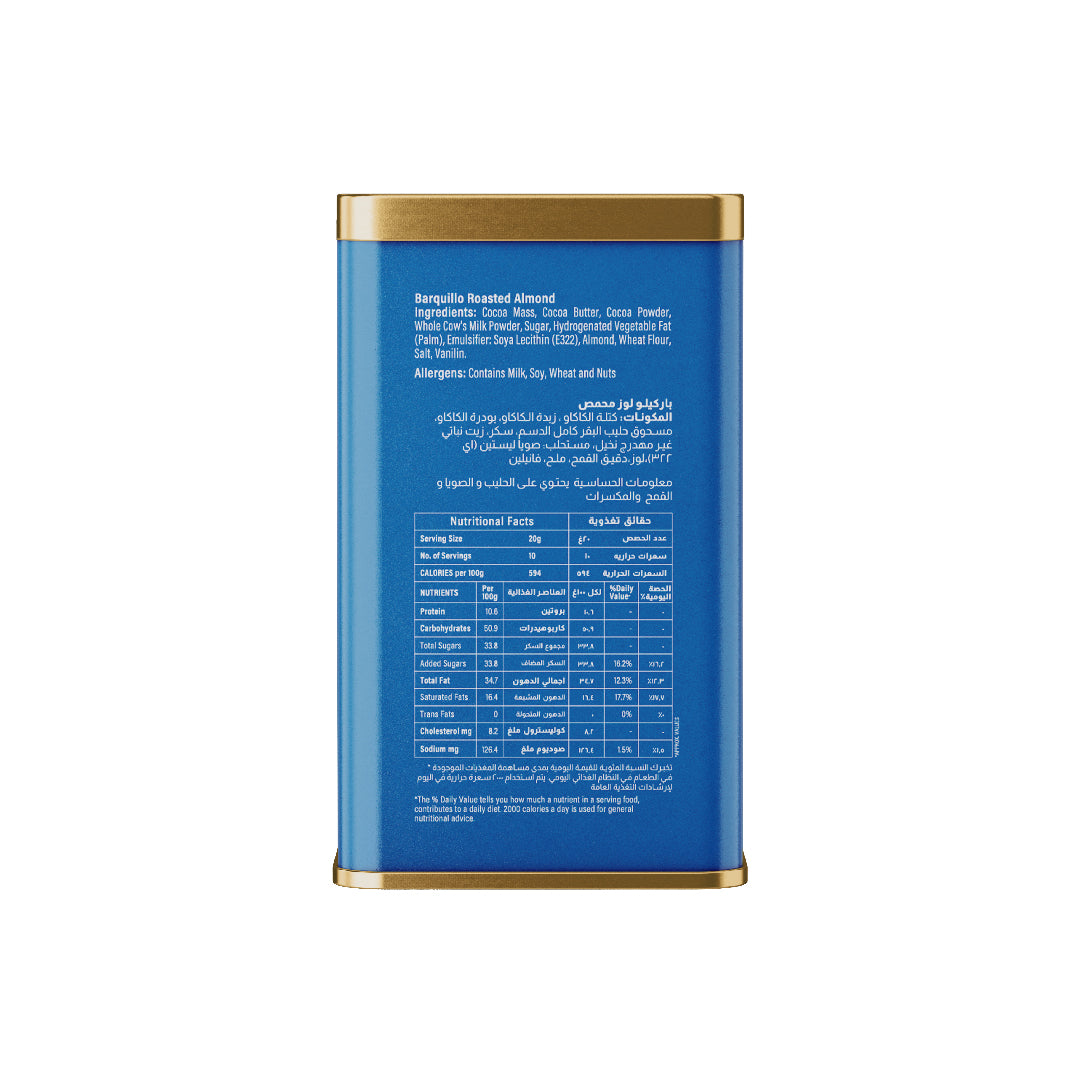 Cocoa Mass, Cocoa Butter, Cocoa Powder, Whole Cow’s Milk Powder, Sugar, Hydrogenated Vegetable Fat (Palm), Emulsifier: Soya Lecithin (E322), Almond, Wheat Flour, Salt, Vanillin.