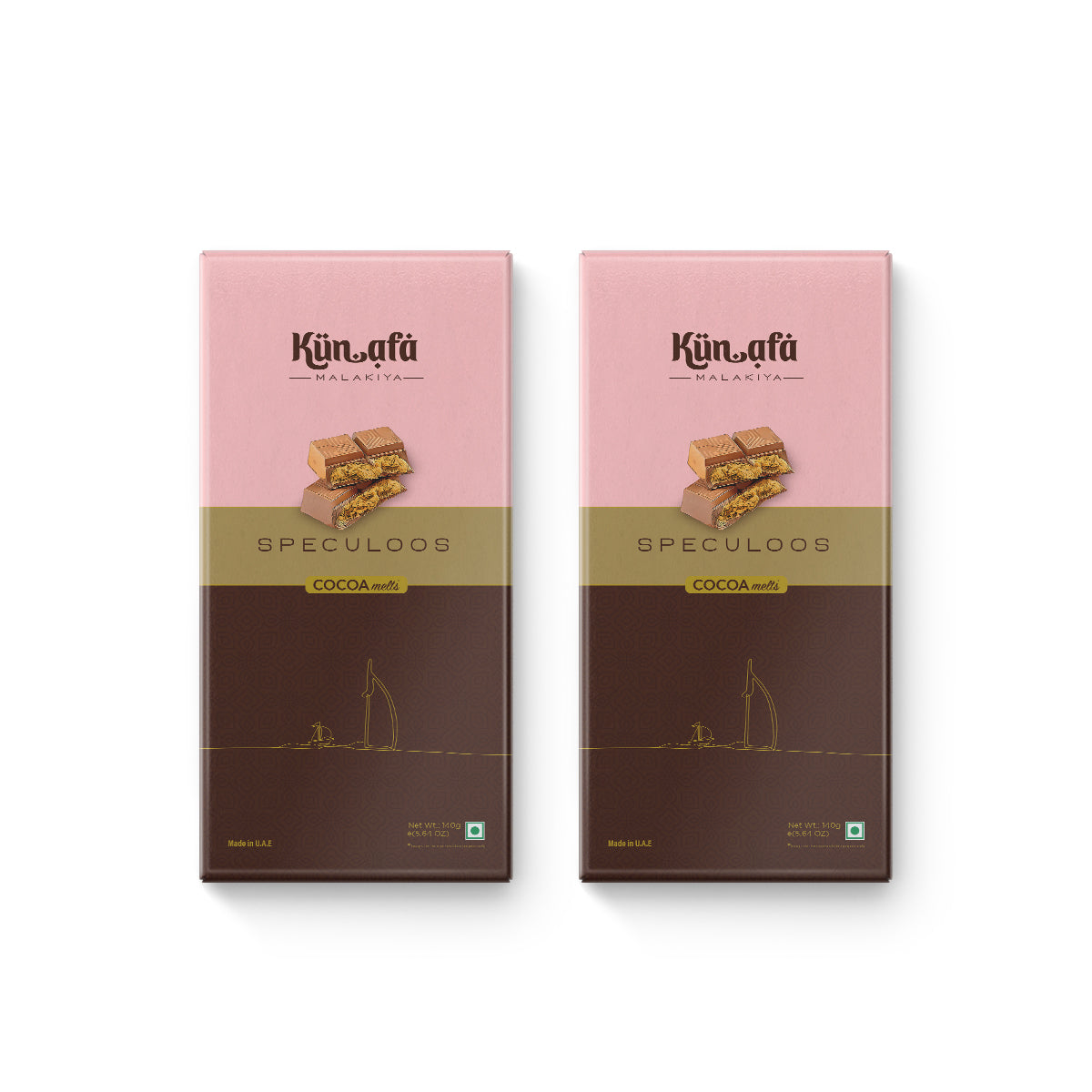 Crunchy Kunafa wrapped in velvety Belgian chocolate and filled with spiced Speculoos biscuit spread. With notes of cinnamon, caramel, and a gentle crunch, this flavour brings the warmth of European bakes to your chocolate bar. Taste a unique fusion of tradition and temptation. Order the Kunafa Speculoos Chocolate now!